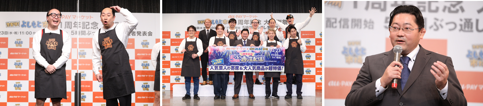 両社は2022年2月8日に「ルミネtheよしもと」にて、本番組説明の記者発表会を実施し、株式会社よしもとセールスプロモーション 取締役 山地克明とau PAY マーケットを運営するauコマース&ライフ株式会社 代表取締役社長 八津川 博史がそれぞれ挨拶しました。そのほか、「生配信!よしもと市場」のレギュラーメンバーであるよしもと人気芸人も登壇し、2月23日に配信する5時間ぶっ通し生配信についての意気込みを熱いトークで披露しました。