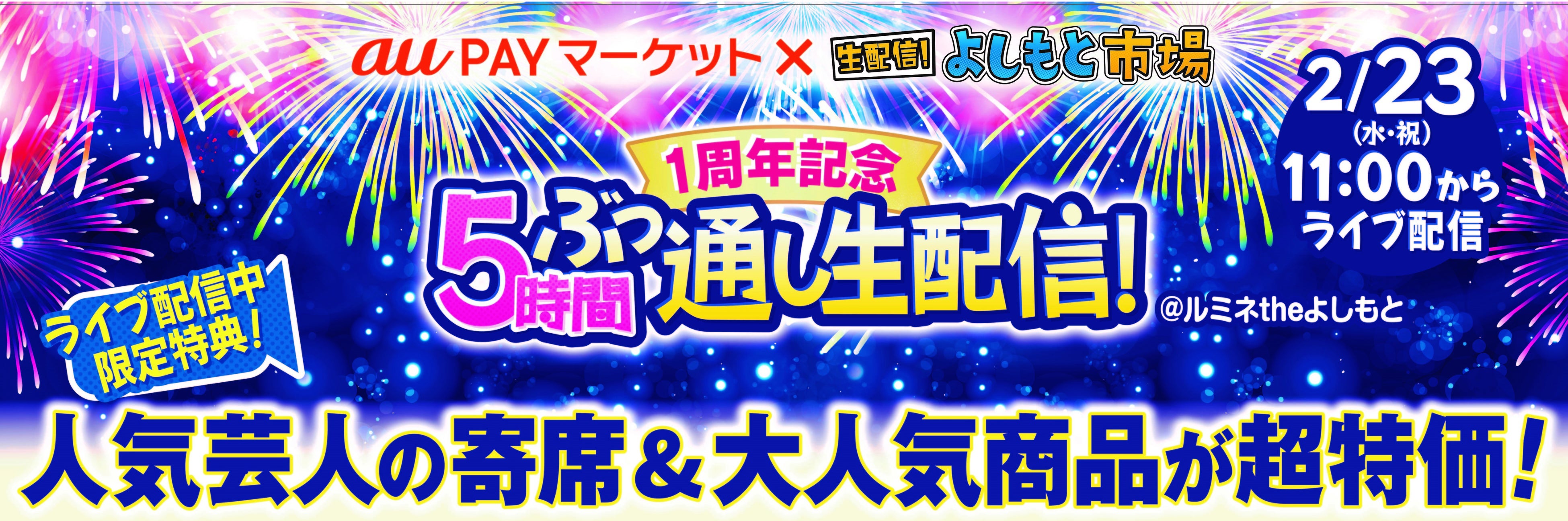 これを記念して、au PAY マーケット「ライブTV」初となる“ぶっ通し5時間生配信の特別番組を2022年2月23日(水・祝)11:00から実施いたします。本番組では、人気商品がライブ配信中限定のクーポンやタイムセールにより超特価で登場し、人気芸人が多数出演するライブ配信限定のお笑い寄席ライブもある、見て、買って、笑っての超スペシャルなライブ配信を予定しております。
