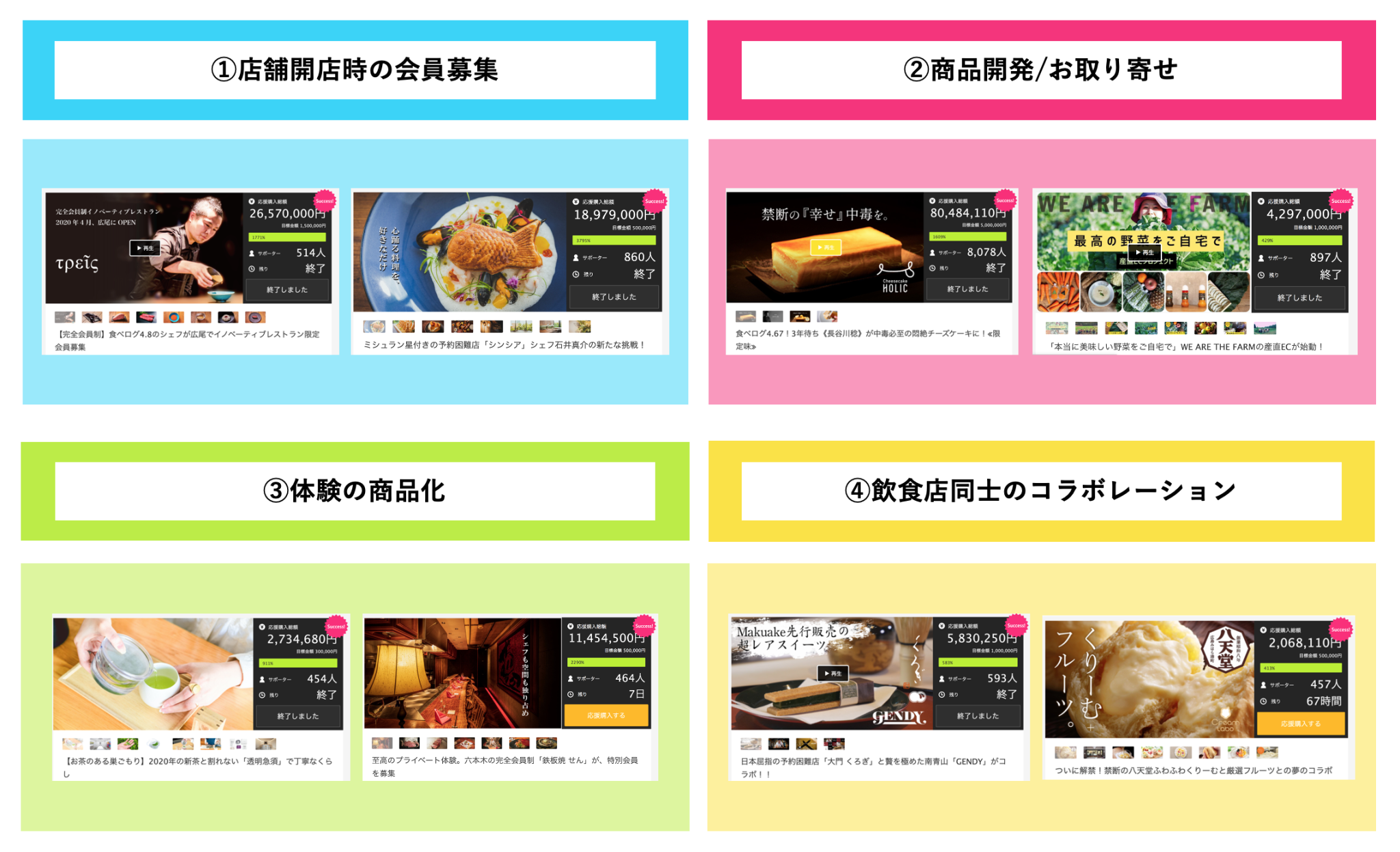 当社は、2013年のサービス開始時から飲食店サポートに力を入れており、飲食店応援購入金額実績で最高額となる8,000万円以上を集めた高級飲食店「長谷川稔」によるチーズケーキのプロジェクトや、ミシュラン星付きの有名店、「焼肉トラジ」などの外食大手の出店プロジェクトなど950以上の全国各地における飲食店の様々な挑戦をサポートしてきました。最近では、店舗オープン時に「Makuake」を活用した「アマラントス」がレストランガイド『ゴ・エ・ミヨ2022』に掲載されるなど、これから有名店になる可能性を秘めた飲食店に出会えるサイトとしての注目も集めています。