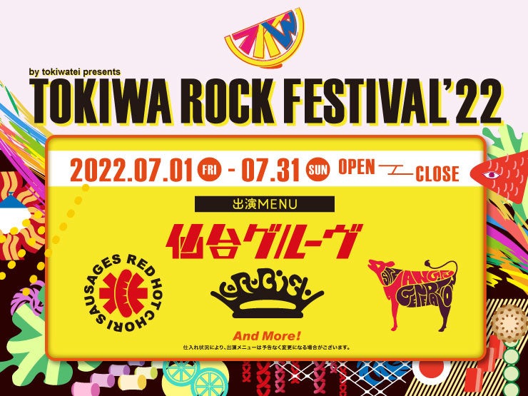 この度、当店では昨年に引き続き、美味しいお肉とロックサウンドをお届けするキャンペーン『TOKIWA ROCK FESTIVAL 2022』を実施致します。今年は7月1日(金)から7月31日(日)の期間限定で、夏フェス気分いっぱいのロックアーティストに見立てたパロディメニューで楽しめます。