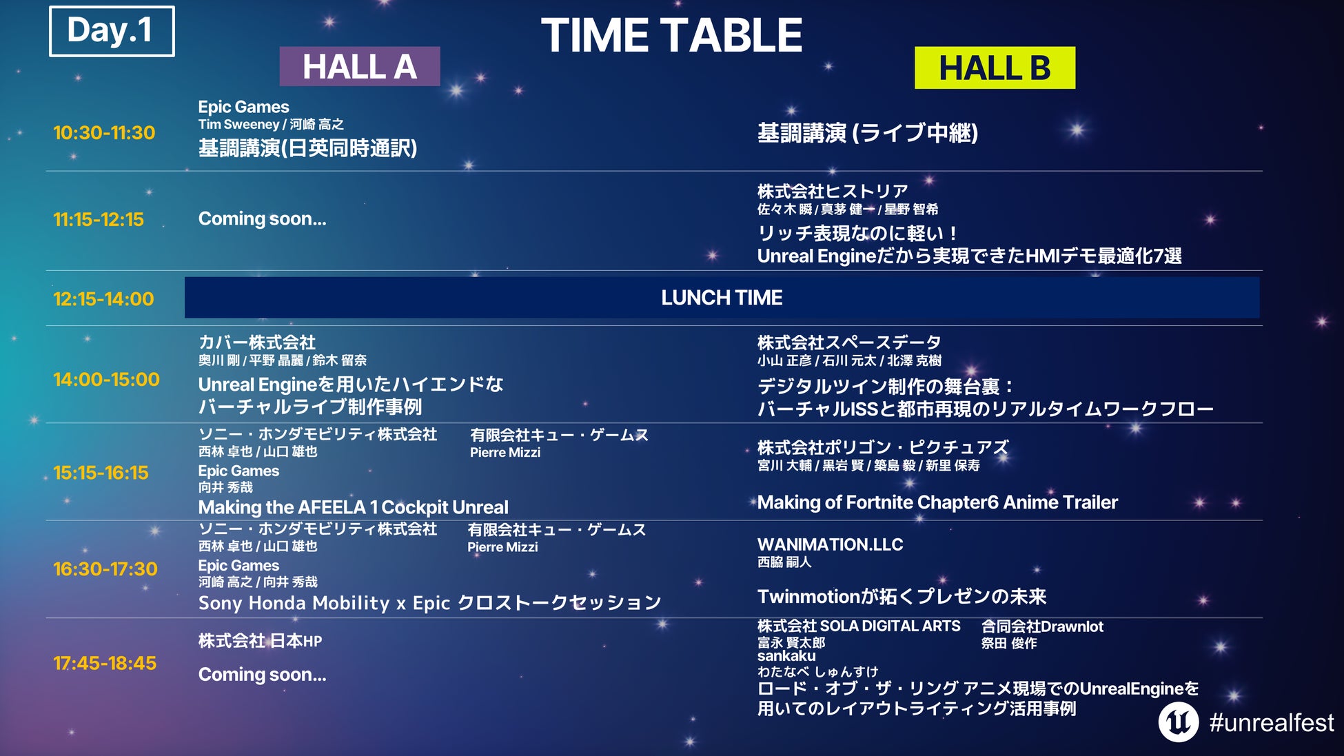 エピック ゲームズ ジャパン(本社:アメリカ合衆国、CEO:Tim Sweeney)は、2025年11月14日(金)・15日(土)の2日間、TAKANAWA GATEWAY Convention Centerにて「Unreal Fest Tokyo 2025」を開催します。Unreal Fest Tokyo では、さまざまな業界の開発者が集い、Unreal Engineの最新機能や活用事例を共有します。このたび、 全セッションのラインナップおよび2日間のタイムテーブルが公開されました。