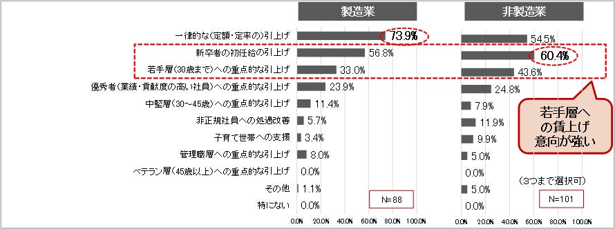 2023年は物価上昇と政府の賃上げ要請を背景に、久しぶりに高い水準で賃上げが実施されましたが、製造業では「一律的な引上げ」(73.9%)の優先度が最も高い割合であったのに対して、非製造業では「新卒者の初任給の引上げ」(60.4%)が最も高い割合で違いが見られました。