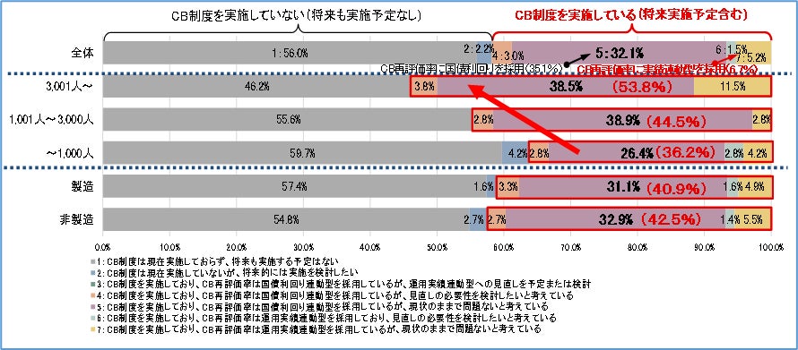 「キャッシュバランス(CB)を実施している(将来実施も含む)」割合は全体で約4割でしたが、従業員3,001人以上の企業が53.8%と最も高く、従業員1,001人~3,000人で44.5%、1,000人以下の企業で36.2%でした。また、CB再評価率は、「国債利回り連動型」が全体で35.1%を占めています。なお、製造業・非製造業での大きな差異は見られませんでした。