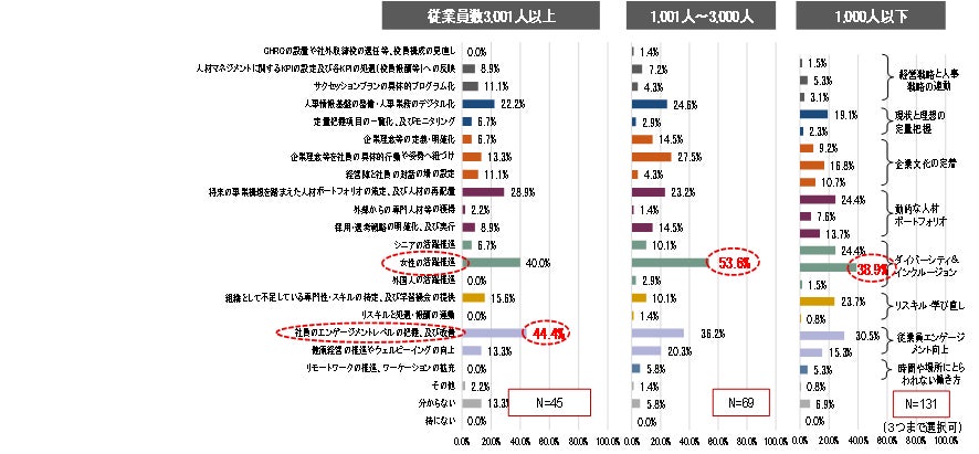 2022年5月に「人材版伊藤レポート2.0」が公表され、人的資本経営の重要性が高まる中、企業の人材戦略でも「ヒト」への投資が重視されてきています。従業員1,001人~3,000人および1,000人以下の企業では、「女性の活躍推進」が最も高い割合(それぞれ53.6%、38.9%)となった一方、従業員3,001人以上の企業については、従業員エンゲージメント向上のための「エンゲージメントレベルの把握及び改善」が最も高い割合(44.4%)を示しました。