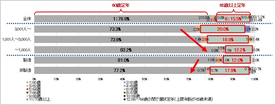 65歳定年の割合を製造業と非製造業別に見ると、非製造業では17.9%で、製造業の12.0%と比べて高い割合となりました。