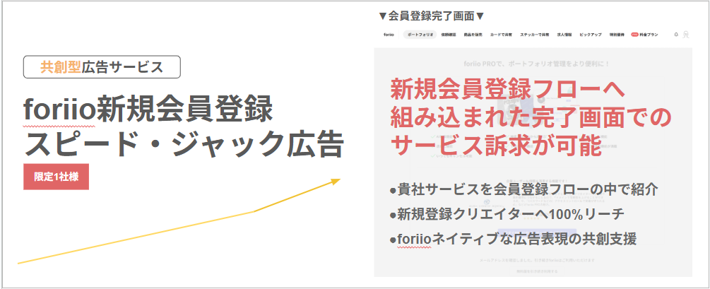 23万人のクリエイターが利用するポートフォリオプラットフォーム「foriio」を運営する株式会社foriio(代表取締役:山田 寛仁、本社:東京都新宿区)は、本日2025年10月15日より、foriioの新規会員登録の完了画面を独占できる新広告メニュー『スピード・ジャック広告』のトライアル販売を、限定1社の共創パートナー向けに開始します。創作意欲が最も高い瞬間を捉えることで、クリエイター向け商材を持つ企業のマーケティングROI最大化に貢献します。