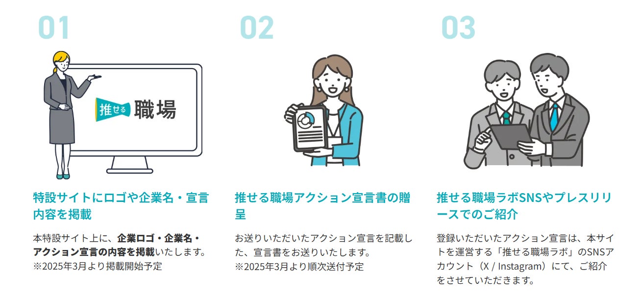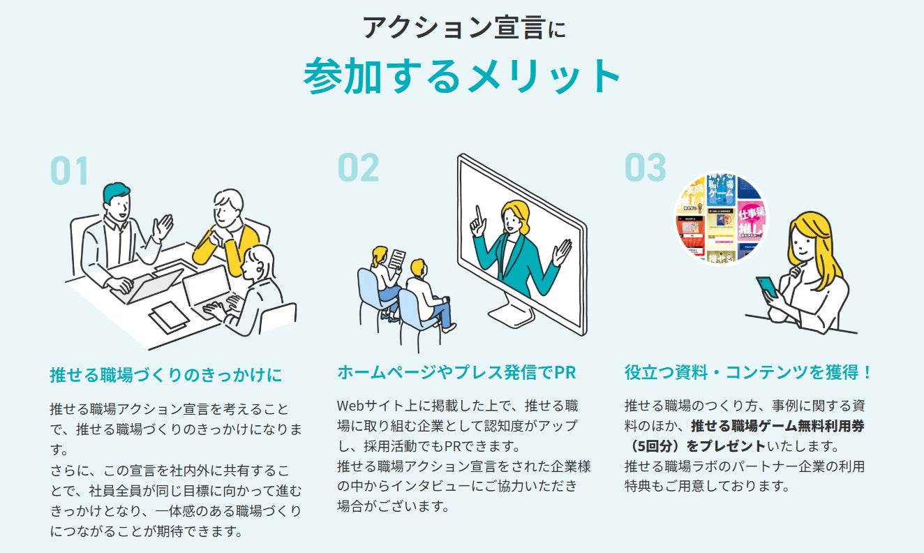 「推せる職場アクション宣言」は、そんな各企業が、魅力的な職場づくりを実現するための具体的な取り組みを掲載し、推せる職場の後押しをします。