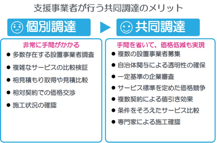 本事業では、支援事業者が一定の基準に基づき複数の設置事業者の提案内容を比較・整理し、導入希望者が最適な事業者を簡便に選定できる枠組みを提供します。また、設置事業者側の提案活動に係る負担を低減することで、サービス価格の抑制につなげます。