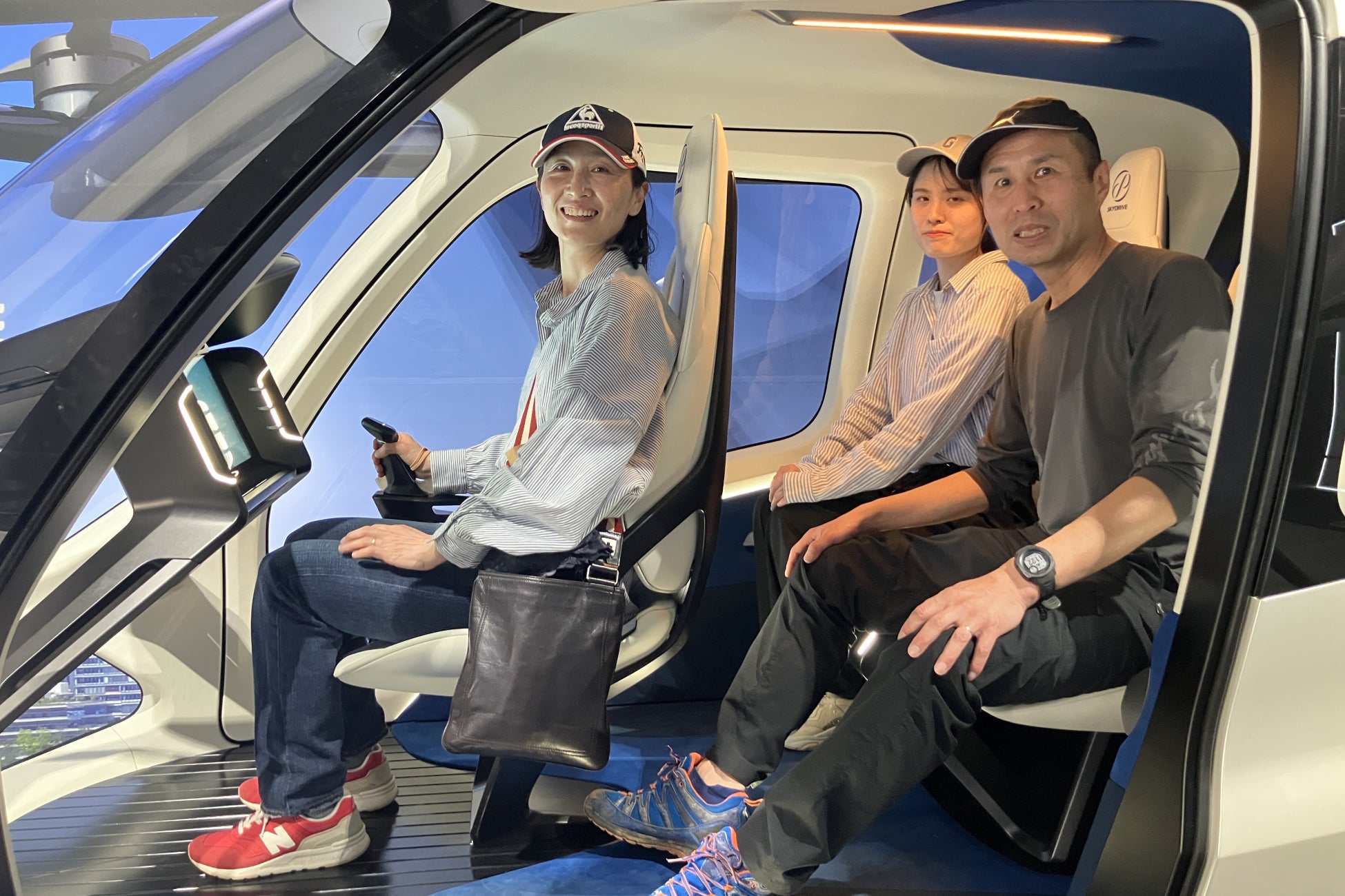 「SKYDRIVE」は、パイロット1名と乗客2名の3人乗りの機体で、ビル屋上など限られたスペースへの離着陸も可能な、電動で環境に優しいモビリティです。機内は快適性を重視して設計されており、乗客一人ひとりにゆったりとしたスペースを確保。後部座席では2名が並んで空の移動を楽しむことができます。また、大きく取られた窓からは広々としたパノラミックビューが楽しめ、まるで空に浮かんでいるような開放感と臨場感を感じていただけます。