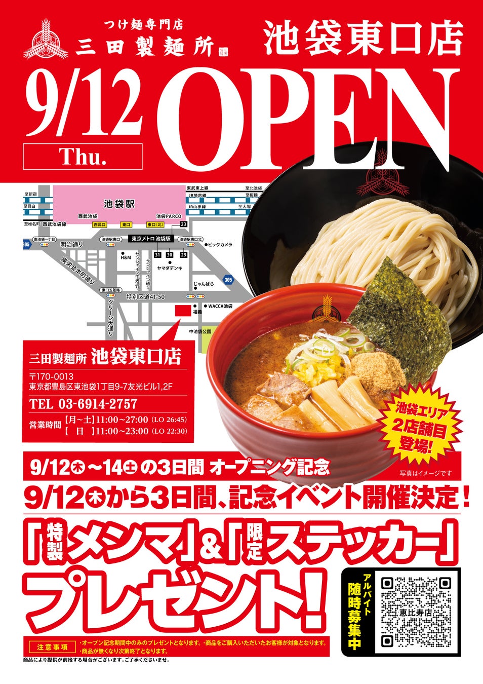 【三田製麺所】9月12日(木)池袋東口に新店舗がOPEN!オープンから3日間は先着で三田製麺所オリジナルグッズをプレゼント!