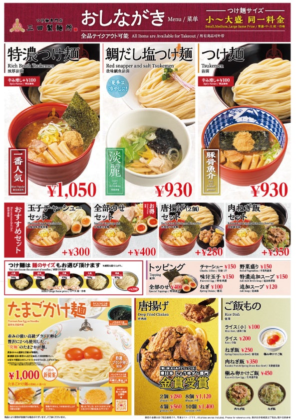 豊富な一品メニューを取り揃えており、つけ麺好きのみならず多くの三田製麺所ファンの皆様に、お楽しみいただける新店舗です。