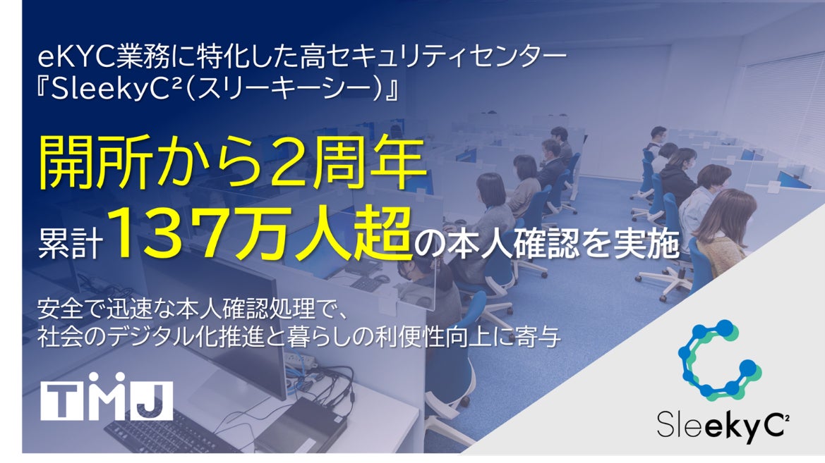 コンタクトセンター・バックオフィス(事務処理センター)の構築・運営を行うセコムグループの株式会社TMJ(本社:東京都新宿区、代表取締役社長:丸山 英毅、以下TMJ)は、自社が運営するeKYC業務専門センター『SleekyC²(スリーキーシー)』が開所2周年を迎え、累計137万人超(2025年2月末時点)の本人確認を達成したことをお知らせいたします。