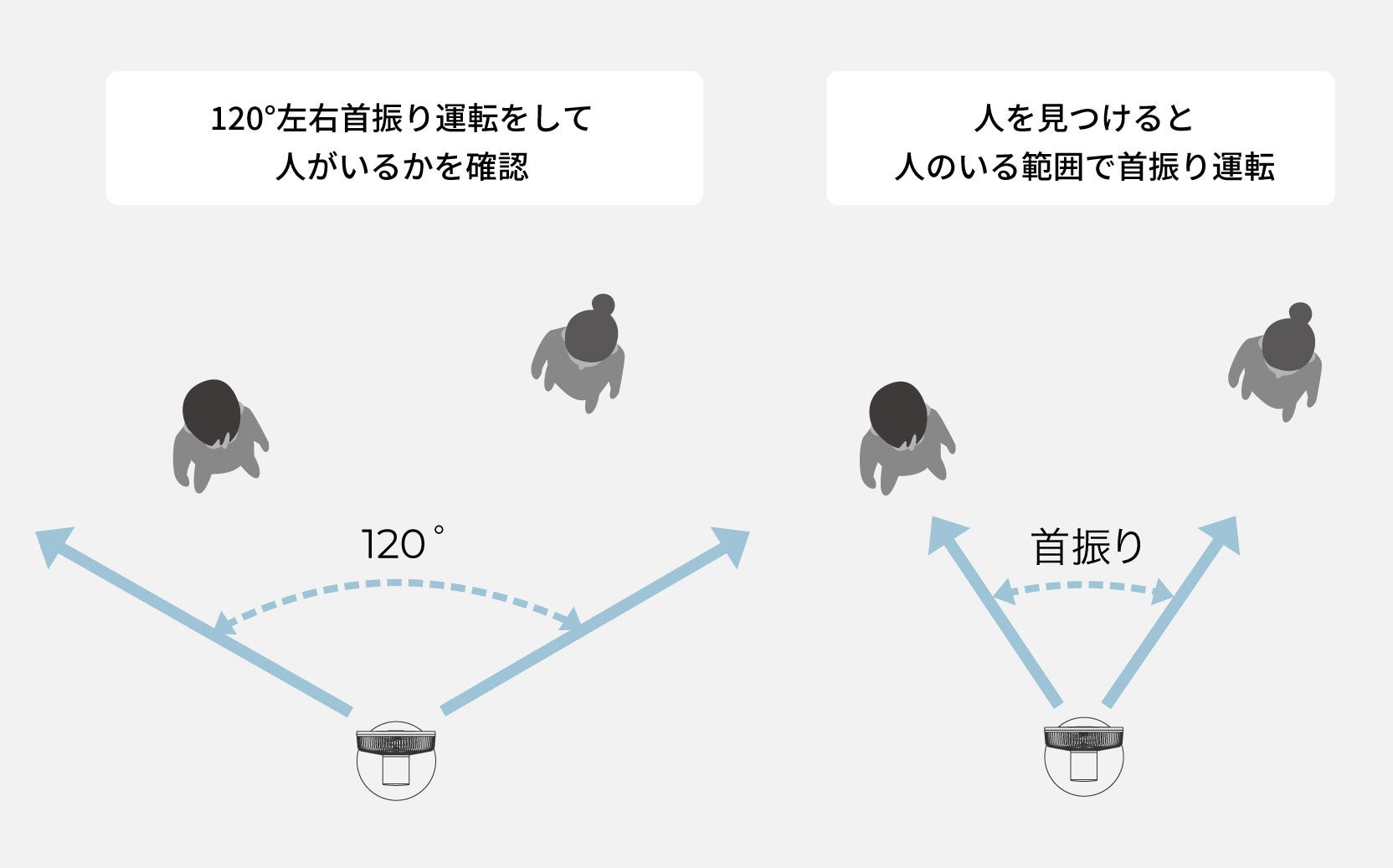 人のいる範囲のみ首振り運転を行うため、無駄のない送風が可能です。ひとセンサー*1が識別した、両端にいる人の間を首振り運転するため、「首振り運転をすると人のいないところにも送風されてしまい、効率的に涼めない」などのこれまでのお悩みを解決し、快適に過ごすことができます。