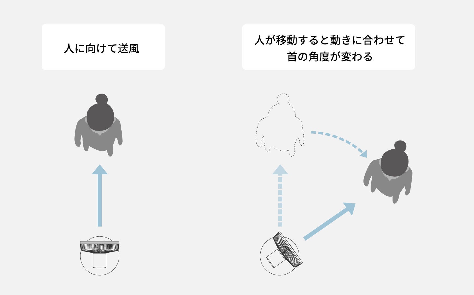 肩から上の形状(顔)で人を識別して送風します。一人でも複数人でも、風が必要な範囲に、効率よく送風できます。