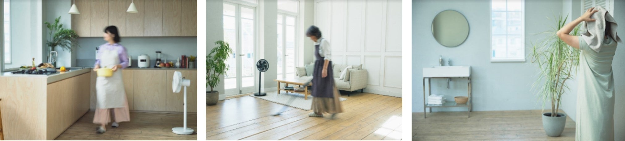 【左から】キッチンでの調理中/部屋の中を行き来する掃除中/お風呂あがりに
