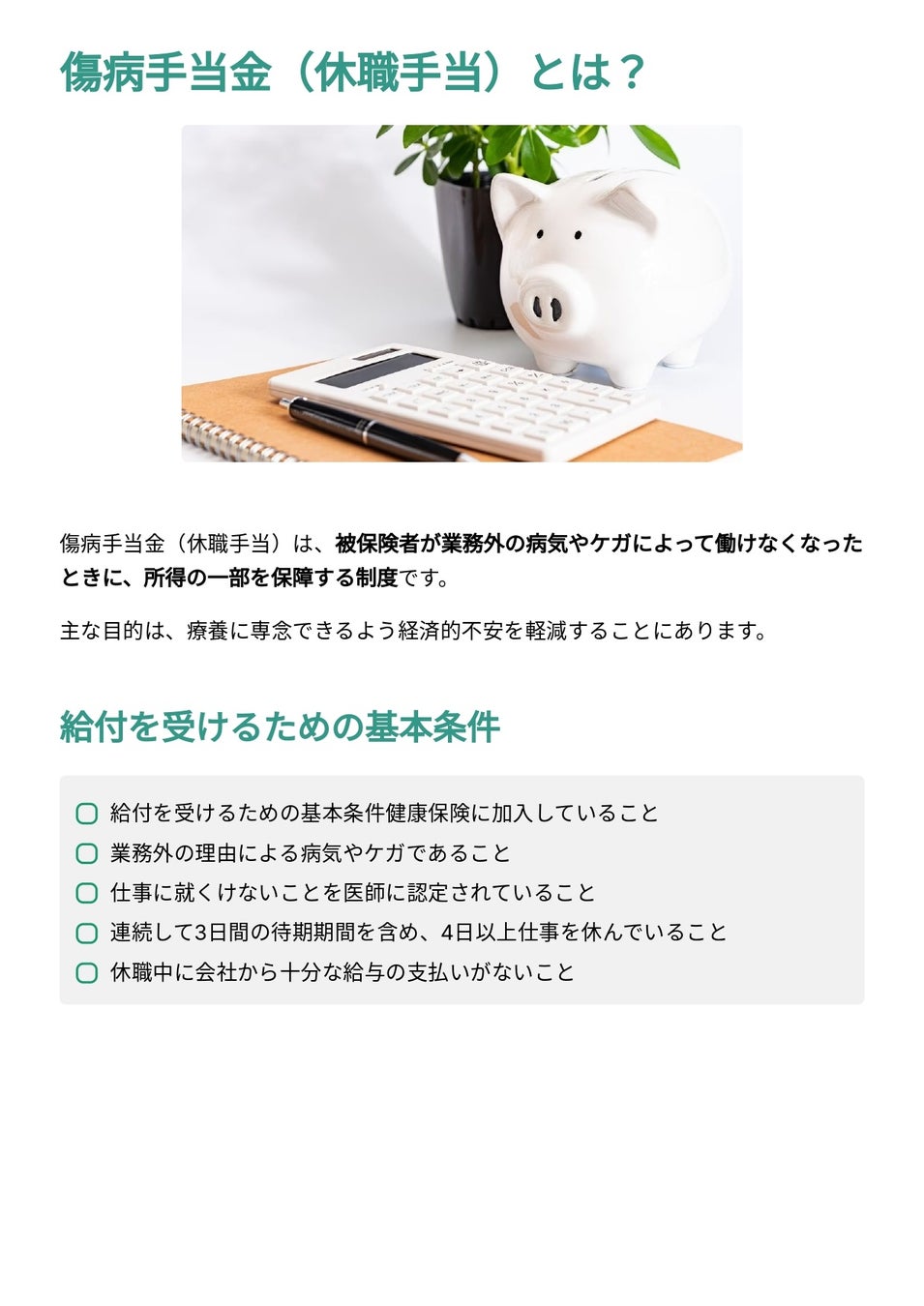 休職手当(傷病手当金)の基本から申請の手順、注意点までを、わかりやすい言葉と図解で丁寧に解説しています。