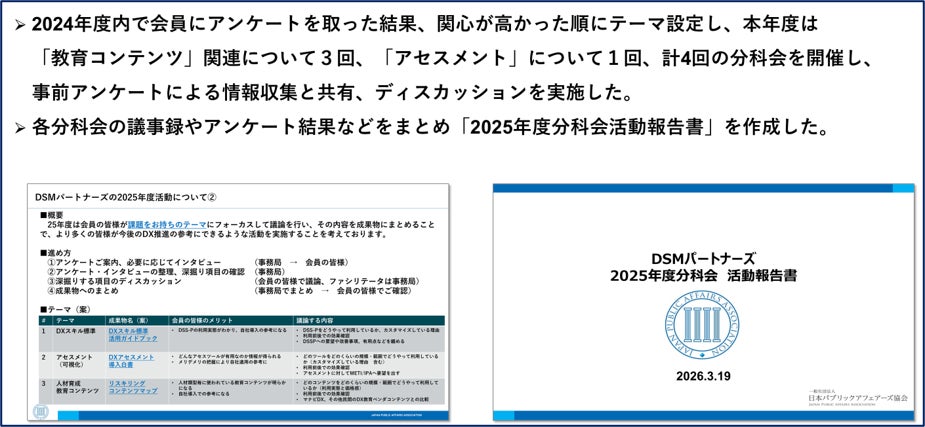 一般社団法人日本パブリックアフェアーズ協会(東京都港区、代表理事:増田寬也)が事務局を務めるDSMパートナーズは、2026年3月19日(木)に2025年度の活動報告会を開催し、企業や自治体におけるDXや人事を担当する方々にご参加いただきました。