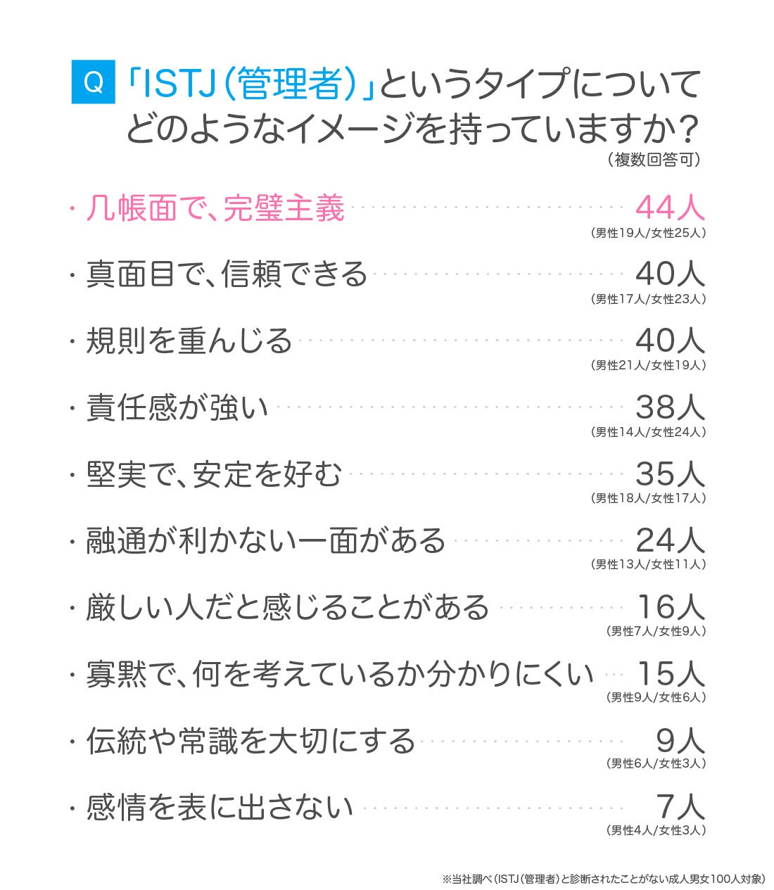 今回のアンケート調査から、ISTJ(管理者)は、「真面目で責任感が強く、信頼できる」というイメージを周囲から持たれていることが分かりました。