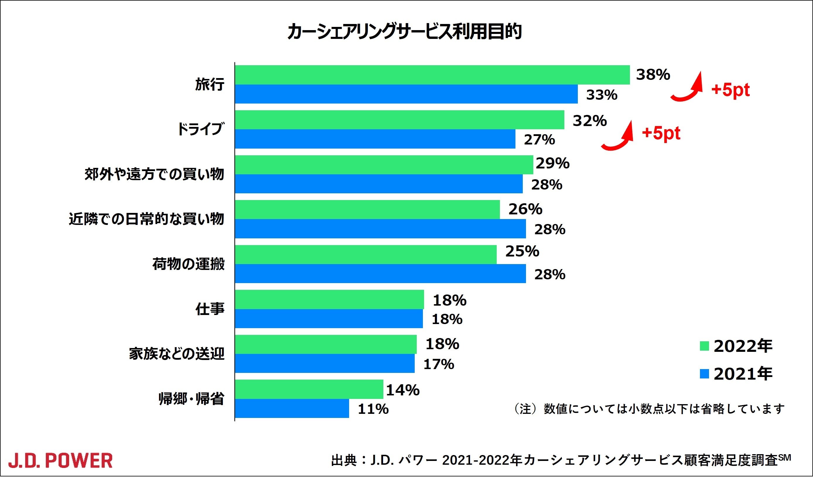カーシェアの利用目的として最も多かったのは「旅行」(38%)で、2021年調査(2021年3月発表)と比べて+5ptの増加となった(下図参照)。また次いで多かったのは「ドライブ」(32%)で、2021年調査と比べて+5pt増加した。新型コロナウイルスのワクチン普及の中、2021年調査では落ち込みを示した旅行やレジャー用途での需要が回復の兆しを示していることが伺える結果となった。