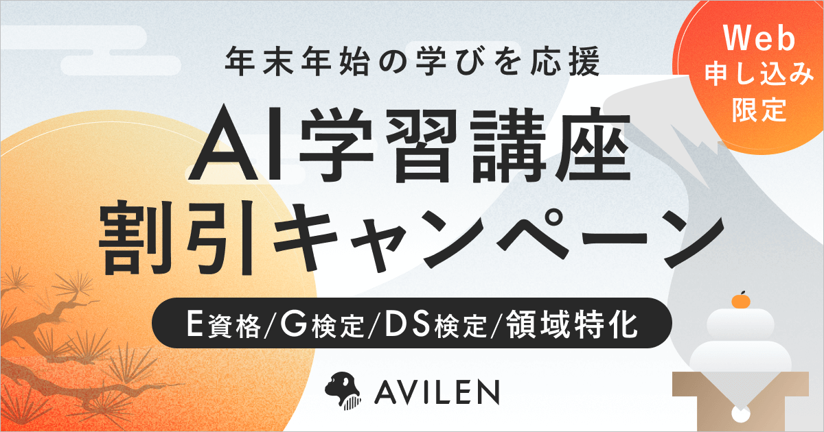 株式会社AVILEN(東京都中央区、代表取締役:高橋 光太郎、以下「AVILEN」)は、2022年12月1日から2023年1月15日まで「年末年始の学びを応援!AI学習講座割引キャンペーン」を開催します。