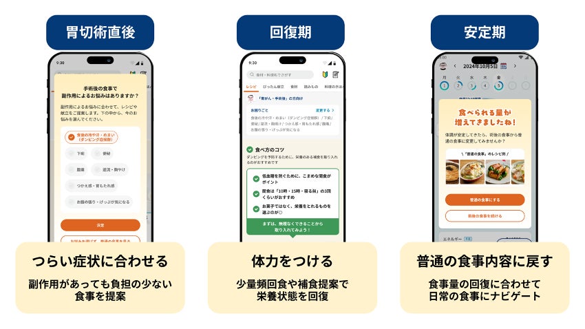 患者はおいしい健康アプリに登録の上、胃がん治療によって切除した部位を登録(全摘、噴門側、幽門側)。これに加えてその時点での消化器・摂食関連症状を選択することで、アプリがその状態に適したレシピ提案を自動で行います。退院直後においては、安心して食べられる簡単なレシピや食品を提案し、栄養の摂取と体力の回復を促します。その後、食事記録やレシピ検索履歴の解析を通じて喫食量(食べられる量)を評価しながら、通常の食事への移行を支援してまいります。また、調理や献立で困った際には、アプリを通じておいしい健康の管理栄養士にいつでも相談することが可能です。