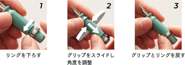 自分の書きやすい角度にペン先とグリップの位置を変えられます。