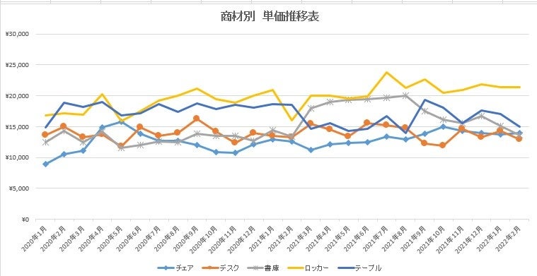 全体的な単価は、引き続き減少傾向となった。オフィス環境はやや鈍化しているが、需要期が近づいてきており企業規模を問わず需要は増加している。その結果、法人販売が増大したことでチェアなどはある程度落ち着いた単価となった。デスクはフリーアドレスデスクの需要も伸びつつある印象である。フォールディングテーブルを活用したミーティングルームなどの需要も回復してきつつあるため、昨年と違いオフィスのニーズが変化またコロナ前に少し戻りつつある様相を呈してきた。世界情勢から原材料の高騰も起きてはじめているので、中小企業ではやや需要が消極的になりつつあり、4月・5月のオフィス環境はやや鈍くなると見込んでいる。