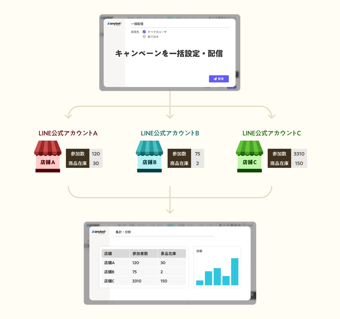 anybot上で複数のLINE公式アカウントを紐付け、友だちデータ・配信設定・施策管理を一元化。