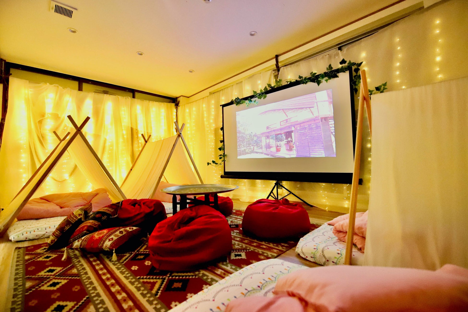 プロジェクター付きの客室で泊まる「HEYAmping(ヘヤンピング)」は大画面で動画や映画を楽しむことができ、ファミリーや女子会に大人気の客室です。