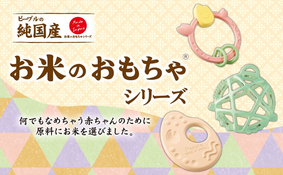 2010年発売のロングセラーベビートイであるピープルの「お米のおもちゃ」シリーズは、その名の通り、国産のお米からつくられたおもちゃです。実際にお米のにおいがするのが特長で、赤ちゃんがなめたりかんだりしても安心・安全なおもちゃとして愛されてきました。