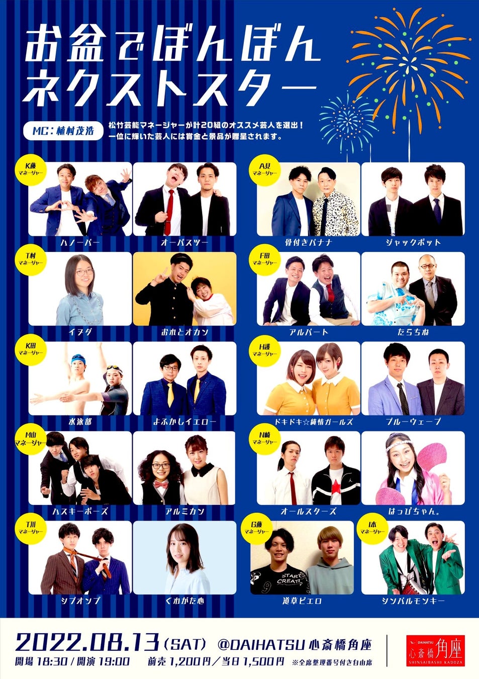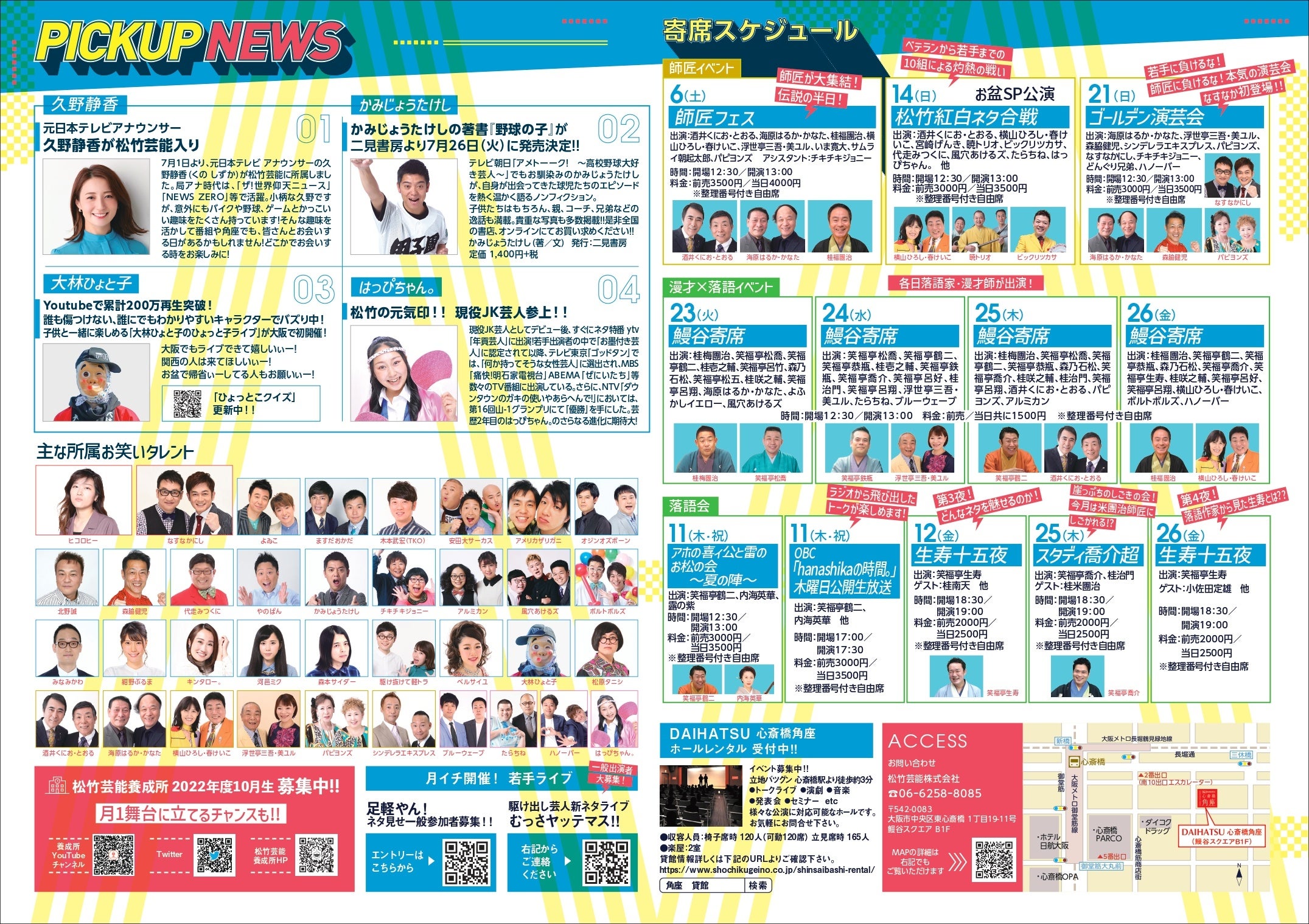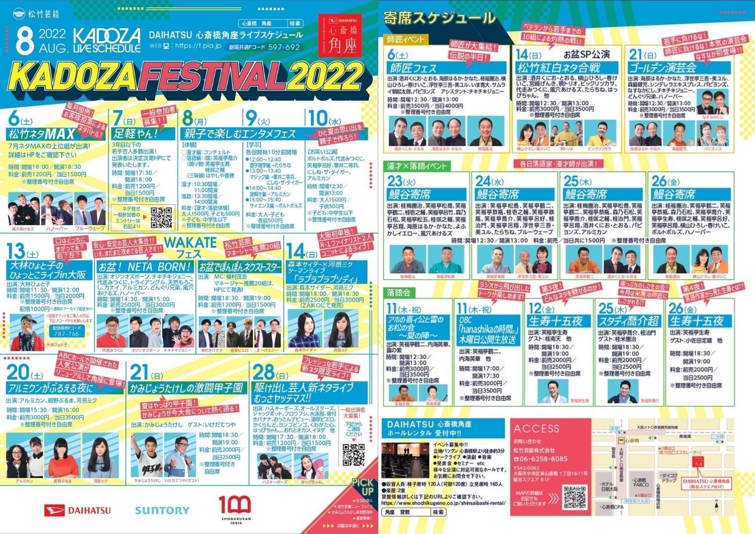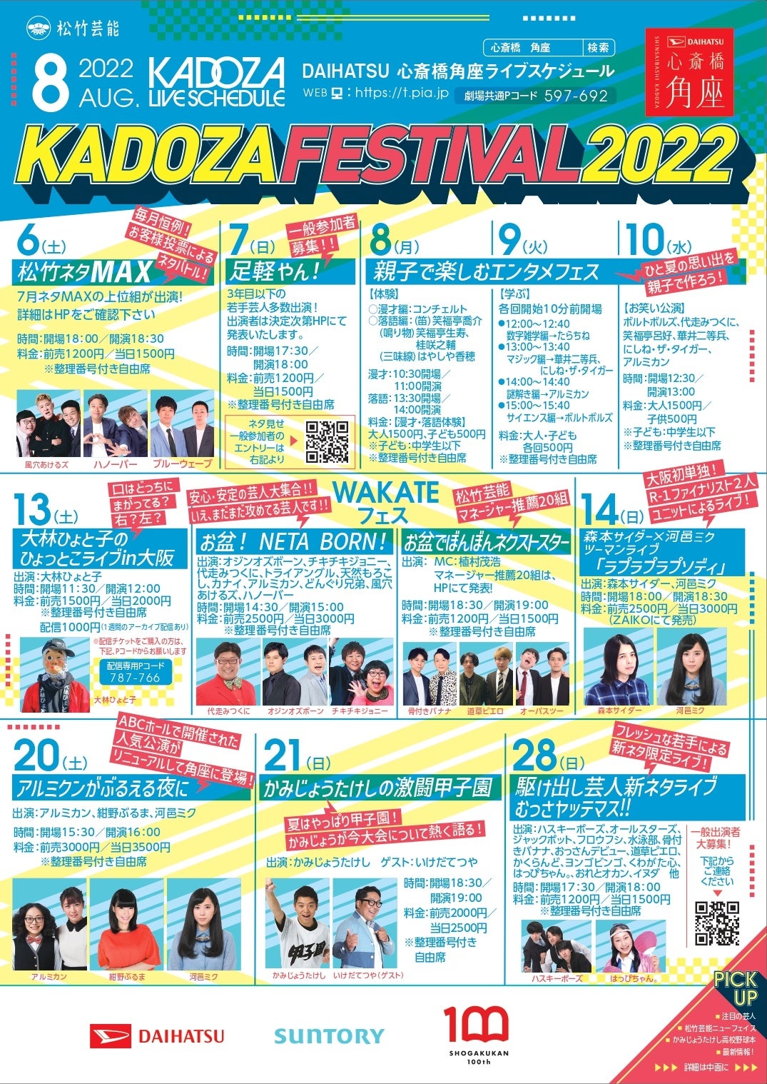8月のDAIHATSU 心斎橋角座は毎月恒例の若手ライブと鰻谷寄席に加え、師匠フェス、親子で楽しむエンタメフェス、WAKATEフェスや「ゴールデン演芸会」・「森本サイダー×河邑ミクのツーマンライブ」などさまざまな公演を開催!またSNSキャンペーン、師匠Tシャツや缶バッチくじなど新グッズを発売!