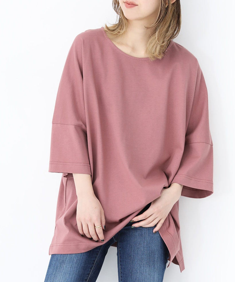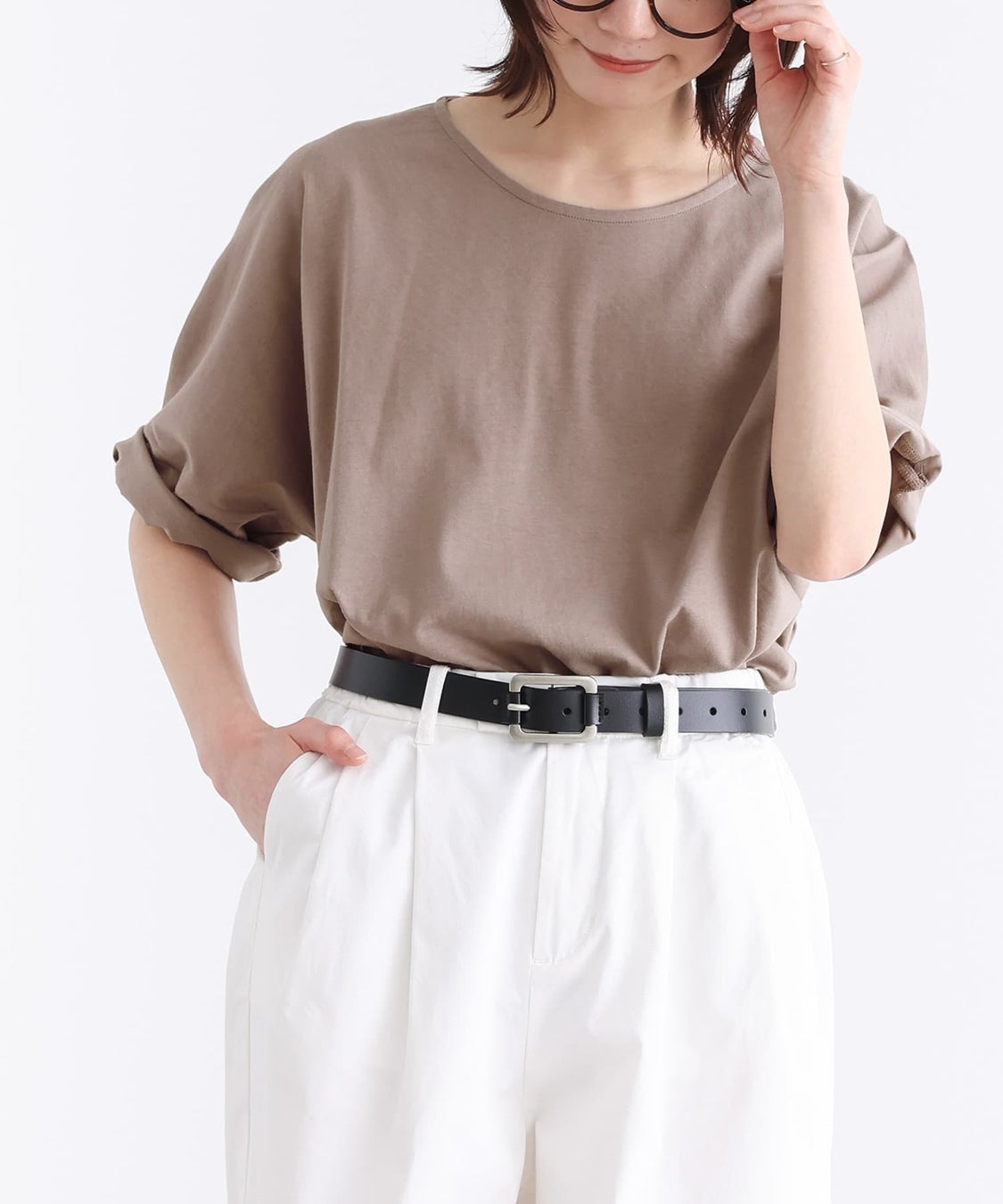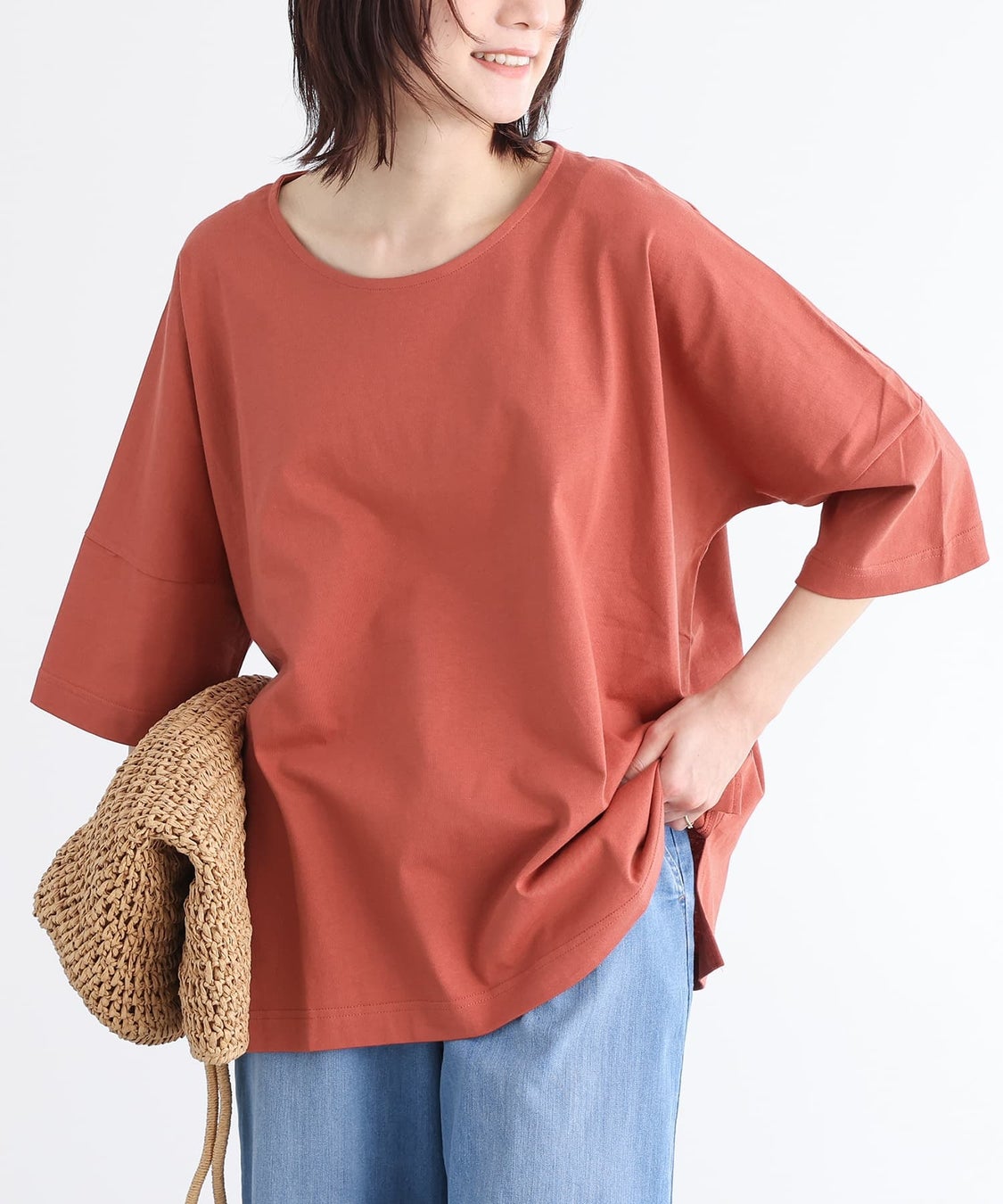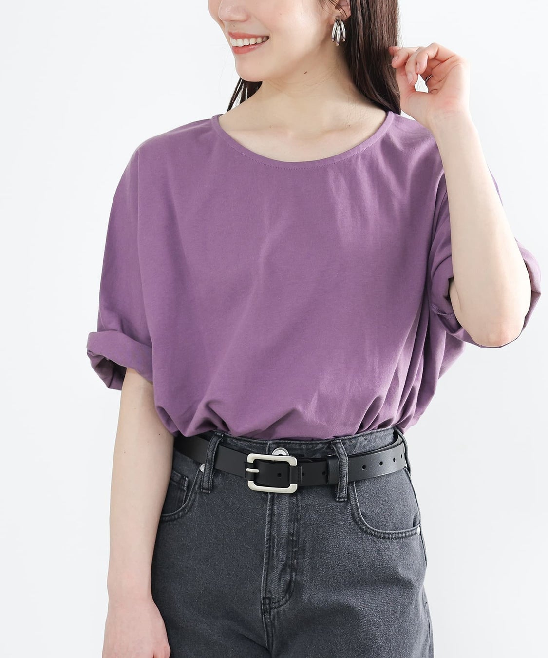 ただのシンプルなTシャツではなく、気になる二の腕やヒップ回りもしっかり隠しながら、着るだけでこなれ感のあるゆったりとしたシルエットが魅力です。
