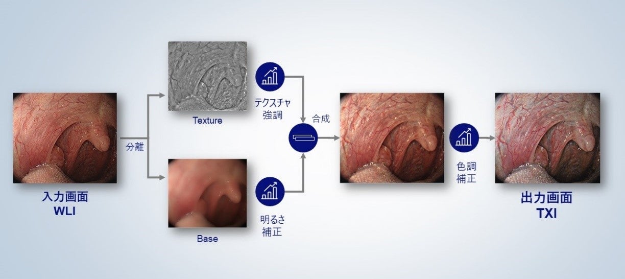 通常光観察下での粘膜表面の「構造」「色調」「明るさ」の3つの要素を最適化する画像技術です。通常光観察では見にくい画像上のわずかな色調や構造の変化が、TXIを活用することにより内視鏡検査中にリアルタイムで強調され、胃がんや大腸がんなどの病変部の観察性能の向上に貢献することが期待されます。