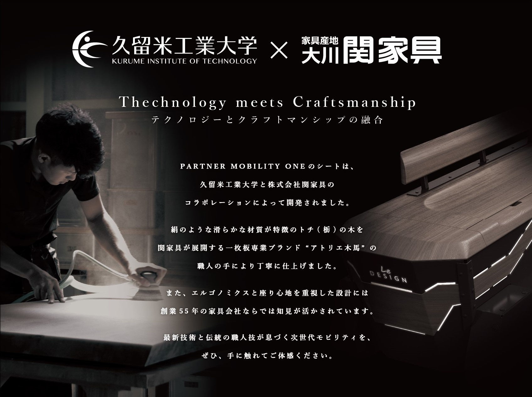 「PARTNER MOBILITY ONE」専用に開発されたシートは、「テクノロジーとクラフトマンシップの融合」をコンセプトに、「人にも優しい使い心地」を目指し、温かみのある木材の使用を検討。久留米工業大学と同じ筑後地区の企業である関家具に専用シート開発のお話をいただきました。創業55周年の知見を活かした心地よい座り心地と、エルゴノミクスを実現する設計となっており、関家具が展開する一枚板ブランド「アトリエ木馬」の職人がトチ(栃)の木から削り出し、加工、仕上げを施しています。日本の特産樹であるトチは、きれいな木目と割れにくく柔らかい触り心地が特徴的。今回はデザインに合わせて樹種に着色を施しシートを製造しています。