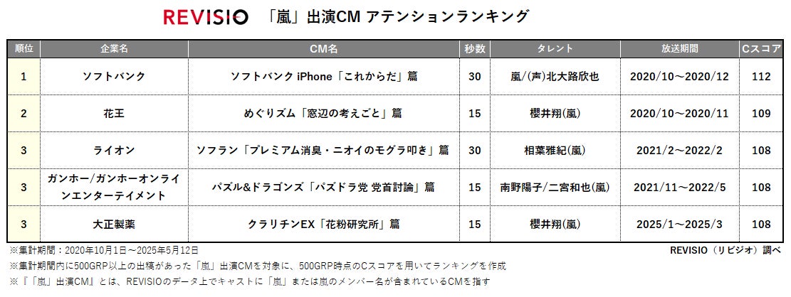 トップ5はソフトバンク、花王、ライオン、ガンホー、大正製薬の嵐メンバー出演CM!