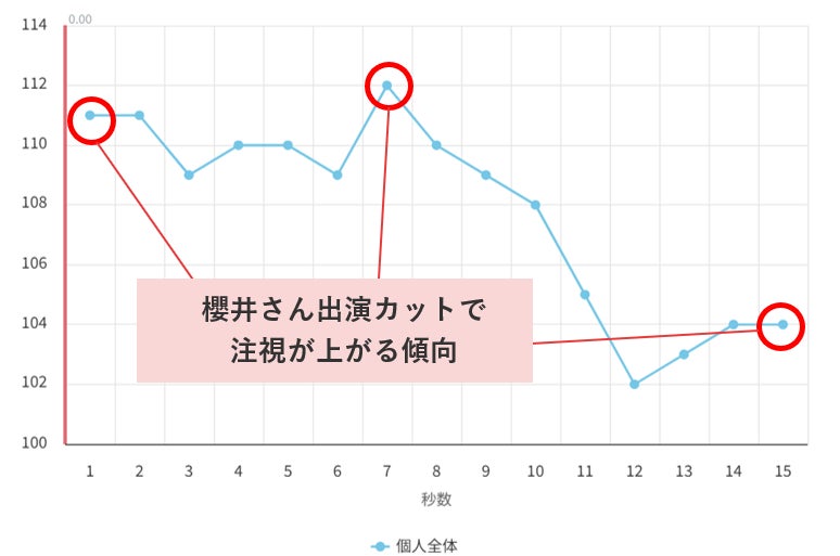 特徴としては「櫻井翔さんが出演しているカットで注視が明らかに上昇している」ということです。視聴者を画面にくぎづけにする櫻井さんのタレントパワーが明確にわかる結果となりました。このCMが高いCスコアを獲得した要因には櫻井翔さんの人気が大きく寄与しているといえそうです。