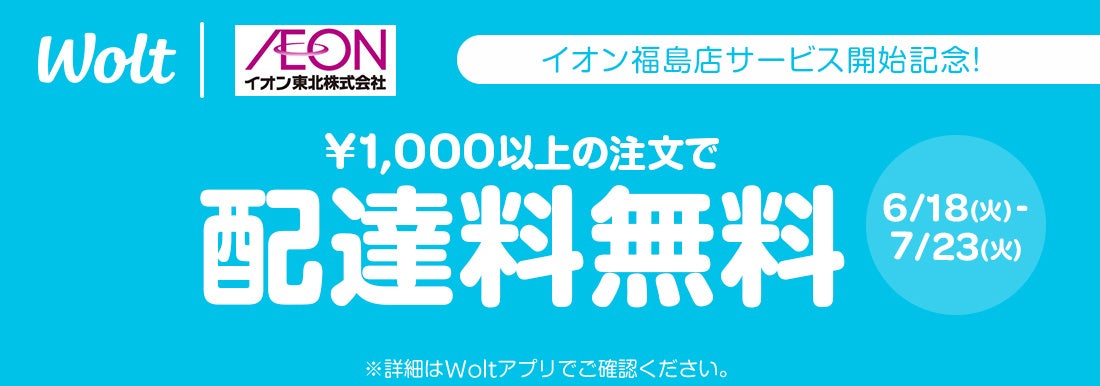 デリバリーサービス「Wolt(ウォルト)」を展開するWolt Japan株式会社(本社:東京都渋谷区、代表:Natalia Khizanishvili、以下 Wolt)と、東北6県でスーパーマーケットを運営するイオン東北株式会社(本社:秋田県秋田市、代表取締役社長:辻󠄀 雅信、以下イオン東北)は、宮城県、岩手県、青森県、山形県、秋田県に次いで6県目となる福島県のイオン福島店にて、2024年6月18日(火)よりサービスを開始いたします。これによりイオン東北が展開する東北全県でのデリバリーが利用可能となります。また、サービス開始を記念して、お得なキャンペーンを実施いたします。