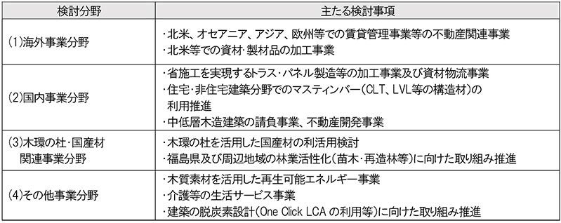 ※2.木材コンビナート:木材利用から、エネルギー利用、ケミカル利用まで価値を高める木材活用を行い、長期の炭素固定を実現するもの。具体的には持続可能な森林から出材される原木を余すことなく使いきるカスケード利用ならびに低級材や端材の価値の最大化を実現するために、木材加工事業の立ち上げを進めていく。