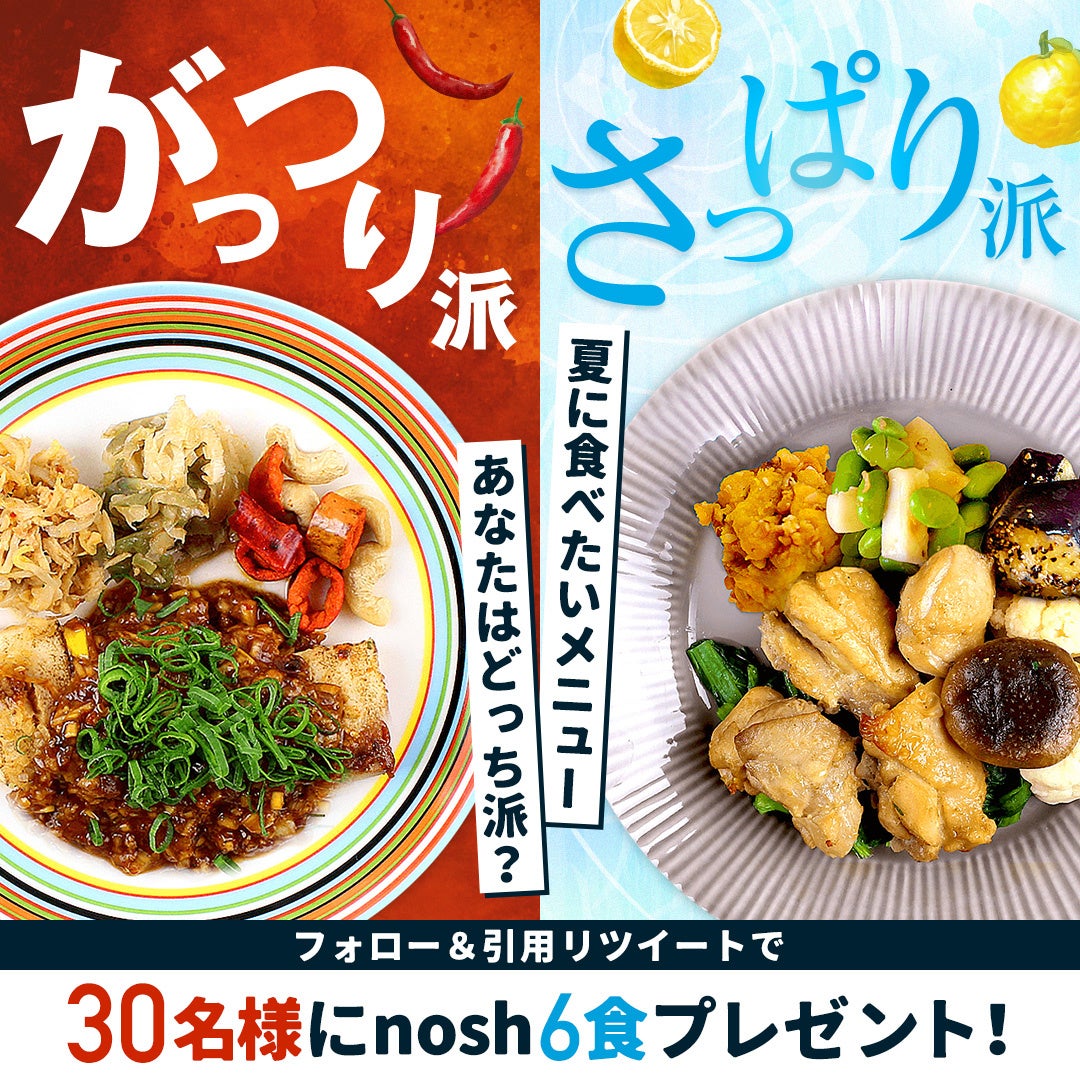 手軽に美味しく栄養管理ができる冷凍宅配食サービス「nosh(https://nosh.jp/)」を手掛けるナッシュ株式会社(本社・大阪市、代表取締役 田中 智也)は、暑い夏に「がっつり食べたい派」か「あっさり食べたい派」かコメントすると抽選でnosh6食セットが40名様に当たるキャンペーンを開始いたしました。