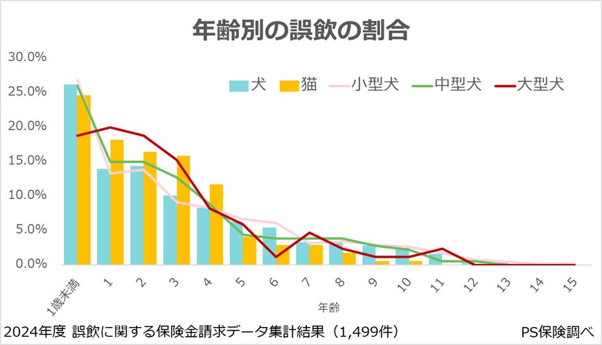 誤飲による保険金請求を行った犬(小型犬、中型犬、大型犬)と猫について、年齢別の割合を調べました。