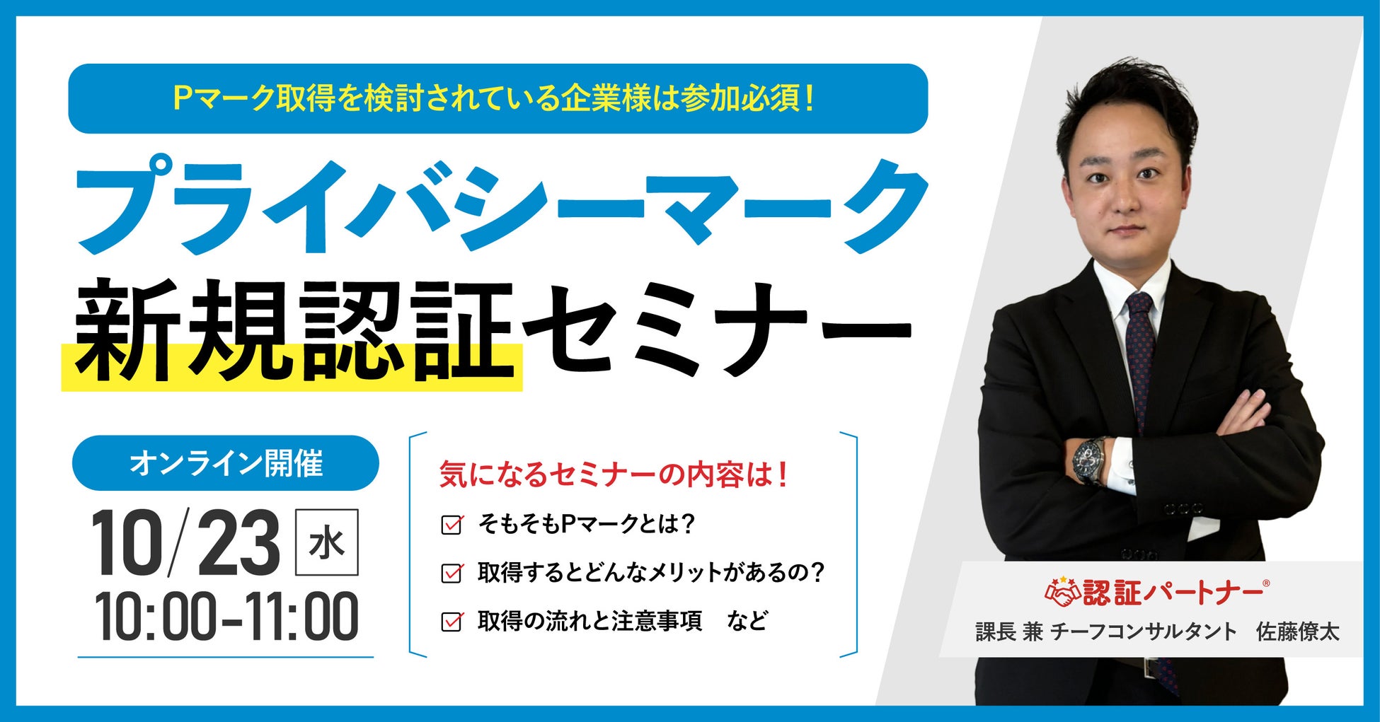 ISO・Pマーク⽀援実績数全国No.1※のISO/Pマークの取得・運⽤⽀援サービス「認証パートナー」を提供する株式会社スリーエーコンサルティング(本社:大阪府大阪市、代表取締役社長:竹嶋 寛人)は、10月23日(水)10:00-11:00「プライバシーマーク(Pマーク)新規認証 無料オンラインセミナー」を開催します。「そもそもPマークってなに?」「Pマークの取得を考えているけど、何から始めたらいいか分からない…」という方へ向け、取得のメリットや取得の流れ、ポイントと注意事項などをPマークのプロが分かりやすく解説いたします。
