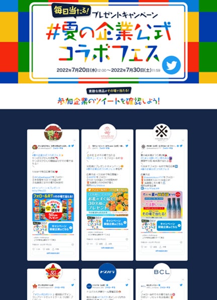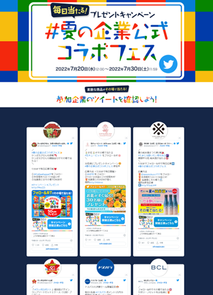 また、参加企業が一覧出来るコラボフェス特設サイトを開設し、Twitterのキャンペーン投稿から特設サイトへ導線を設置することで、キャンペーン参加したTwitterユーザーに新たな企業アカウントを発見してもらい、より多くのユーザーと企業のつながりを生み出すことを目指しました。