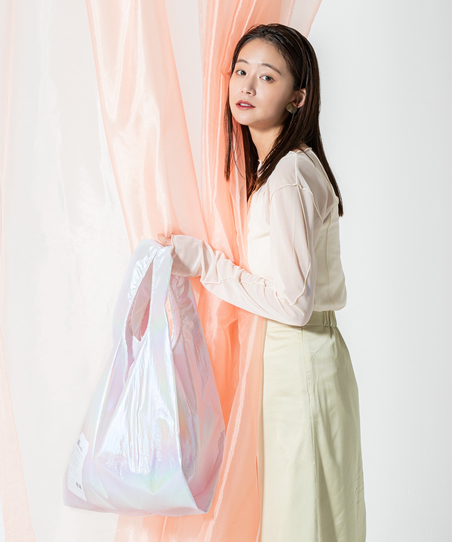 光沢のあるキラキラとした生地は光の当たり方や強弱、見る角度によって色が変化。七色に輝く様子を楽しむことができます。カラーは暗くなりがちな秋冬の装いにアクセントを添えるオフ、ラベンダー、ミントの3色展開で、バッグの左下に入るブランドネームがポイント。スタンダードな形の「トートバッグ」はA4が入る大きさで使いやすさ抜群。また口が大きく開く「エコバッグ」は幅広のマチがあり、見た目以上の収納力で荷物もしっかり入るのが特徴。メインバッグとしてもサブバッグとしても大活躍すること間違いなし。