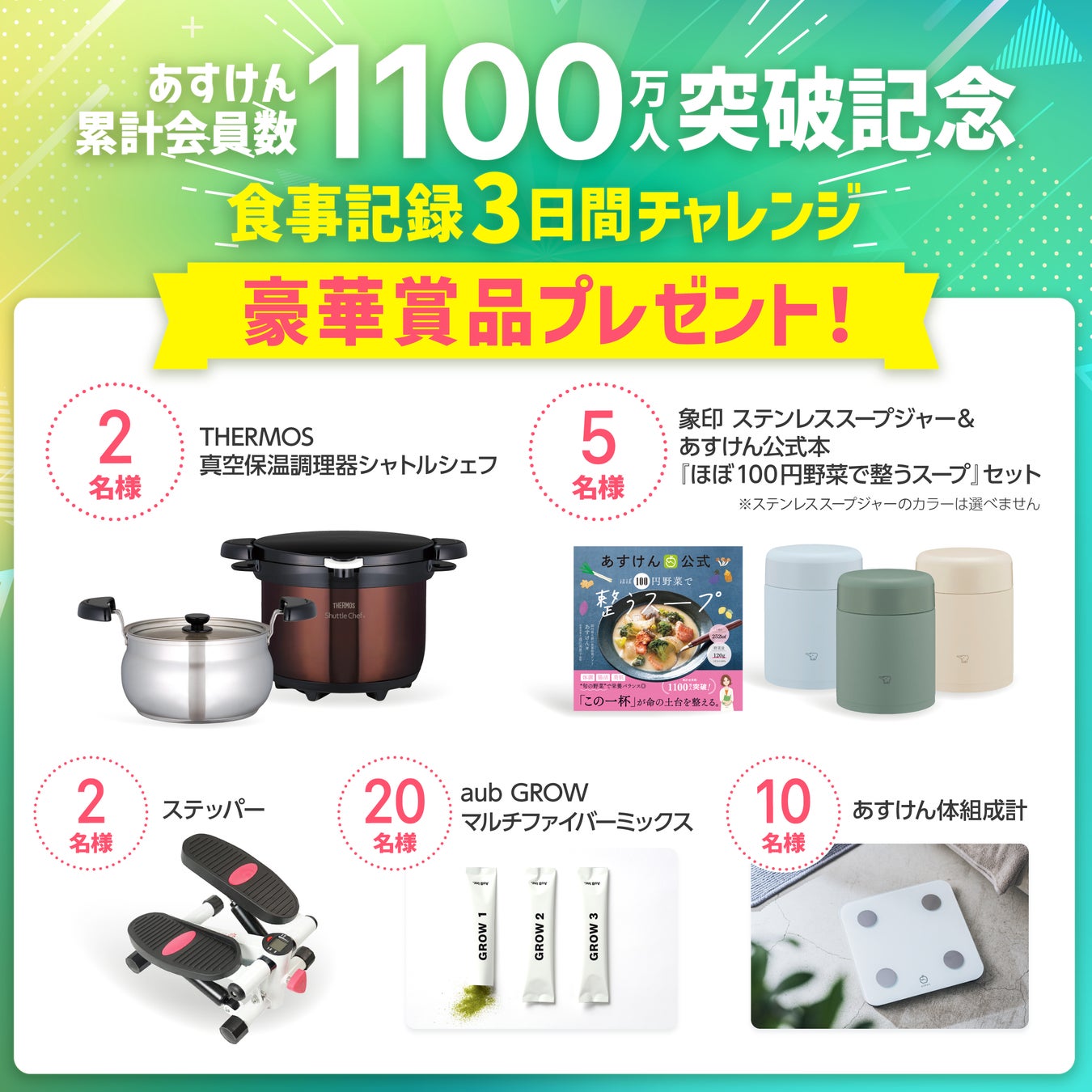 『あすけん』、累計会員数が1,100万人を突破!~約6カ月で会員数100万人増加、感謝を込めて豪華賞品が当たるキャンペーンを開催~