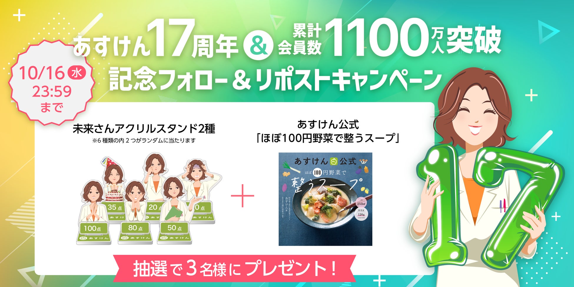 株式会社asken(東京都新宿区、代表取締役社長 中島洋、以下「当社」)は、開発・運営を行う国内No.1*¹のAI食事管理アプリ『あすけん』の累計会員数が1,100万人を突破したことを発表いたします。また、2024年10月1日で当社が創業17周年を迎えたことも記念し、お客様への感謝を込めて、キャンペーンを開催することをお知らせいたします。