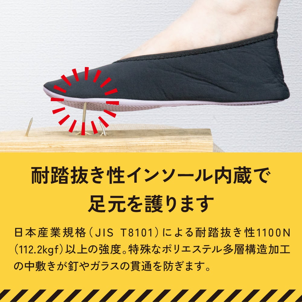踏抜きに強い、折りたたんで持ち歩ける携帯用防災シューズです。