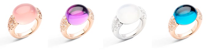 今回発表となる4種のリングは、「イコニカ」の特徴であるミニマルな装いを踏襲し、滑らかなゴールドのフォルムをたっぷりとしたサイズ感で表現しています。ファセットのないカボションカットを選んだのは、プレシャスストーンのユニークな着こなしを追求するポメラートらしいアプローチと言えます。1990年代にソフトで滑らかなシェイプの華やかなカラーカボションとボリュームあるゴールドのフォルムをミラネーゼジュエラーであるポメラートが融合させて以来、丸みを帯びたカボションカットはメゾンのシグネチャーとなっています。この10年間に多くの人々に愛されポメラートの定番ともなったカボションストーンは、「イコニカ」のカクテルリングに新たな命を吹き込みました。