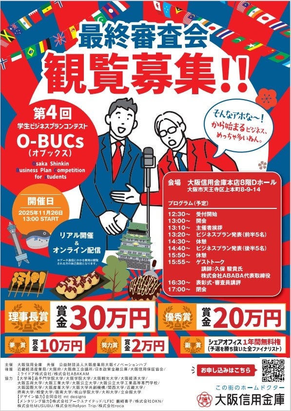 大阪信用金庫(理事長 髙井嘉津義)が主催する「第4回学生ビジネスプランコンテスト“O-BUCs (オブックス)” 」の最終審査会を11月26日(水)に大阪信用金庫本店8階Dホールにて開催いたします。