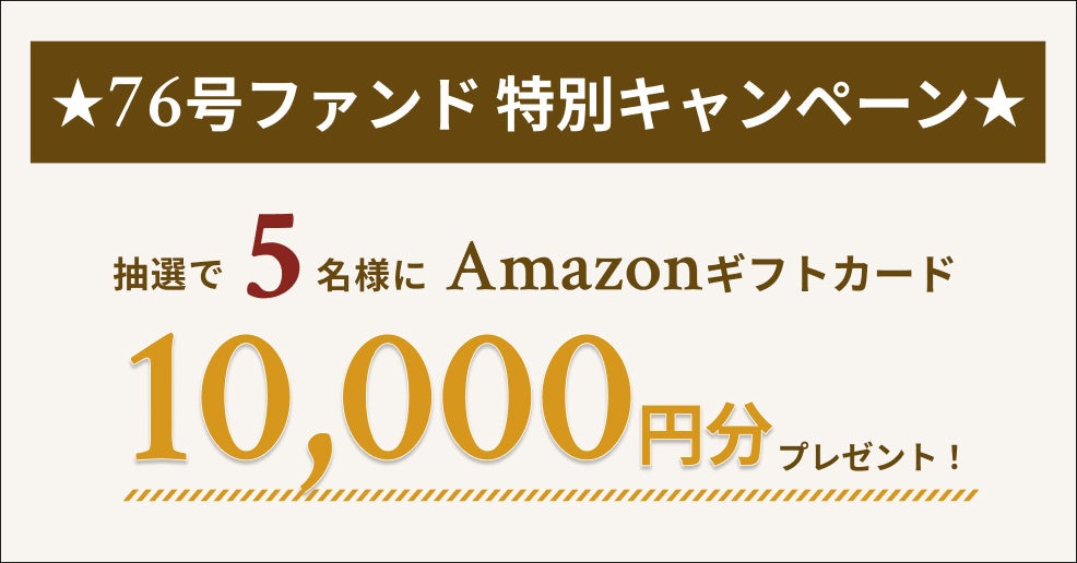 そこで、より多くのみなさまから、より多くのご投資をいただくきっかけとすべく、本ファンド特別キャンペーンを実施いたします。本ファンドへご出資いただいた投資家のみなさまの中から、抽選で5名様にAmazonギフトカード1万円分をプレゼントします。