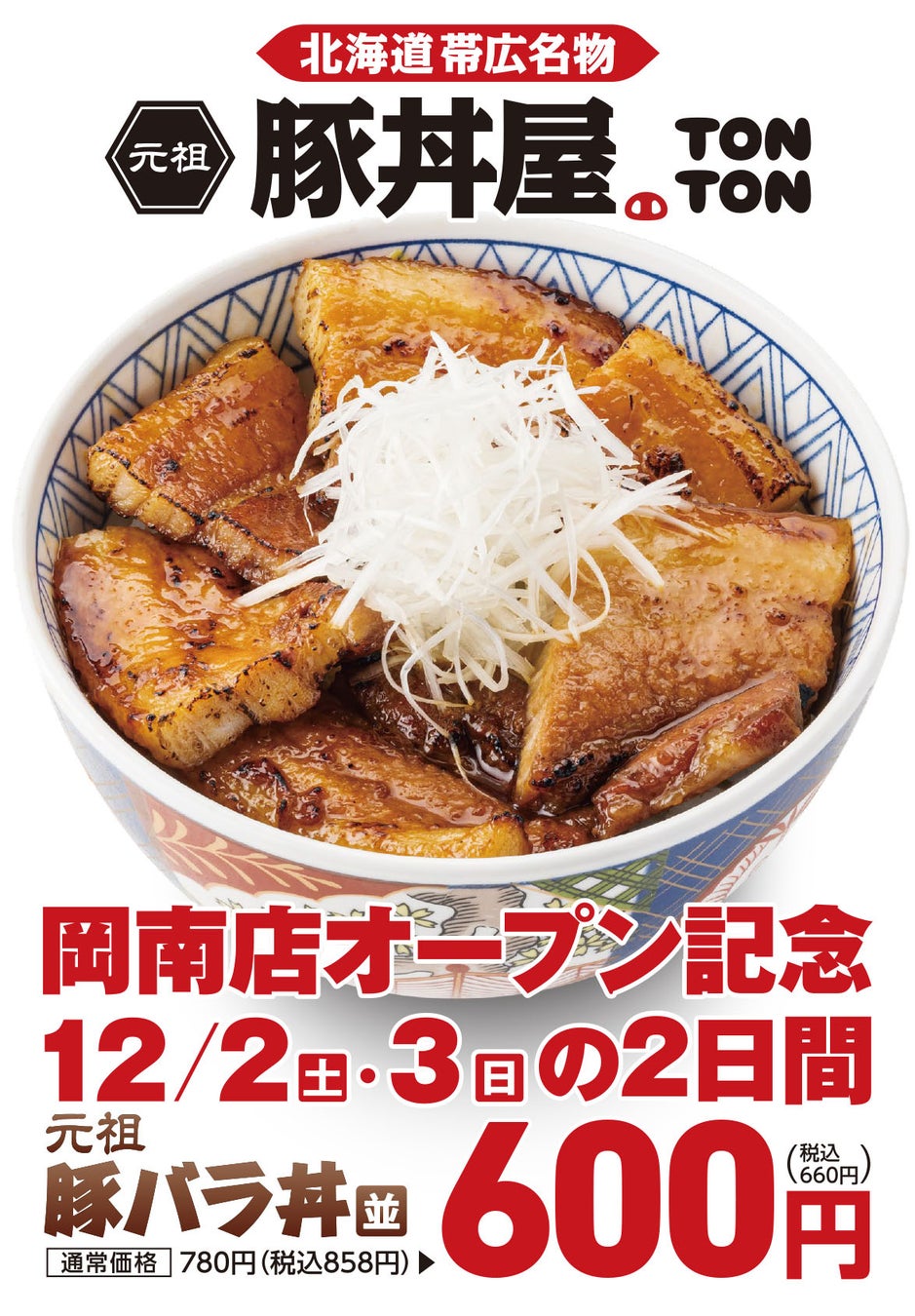 岡南店のオープンを記念して、12/2(土)・3(日)の2日間に限り、TONTON自慢の「豚バラ丼〈並〉」をオトクな価格にて提供いたします。